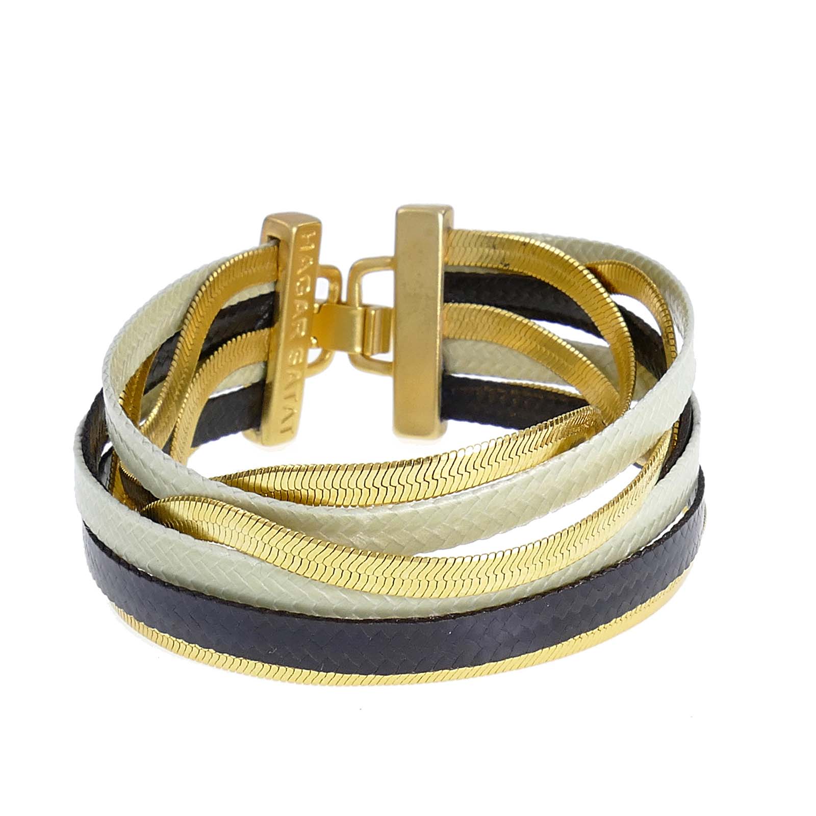 A charming bracelet from the Galactic collection. Colorful cotton straps combined with metal snake chain straps in 24-karat gold plating in a matte shade and black plating are combined together into an impressive metal clasp, also coated with a high-quality coating. Special and summery. Bracelet length - 18 cm.