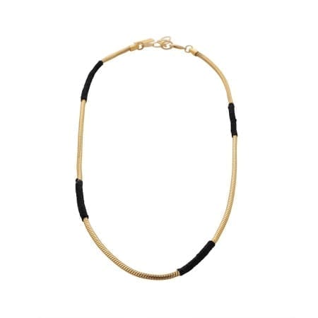 Elegant snake necklace plated with 24 carat gold in a matte shade with sections of colored wax thread wrapped. A bag with a twist can be worn as a necklace and also as a coiled bracelet, blends well with other jewelry. The necklace is about 50 cm long. And another 5 cm extension.