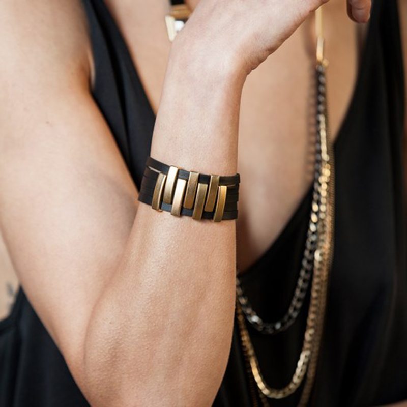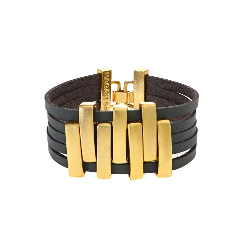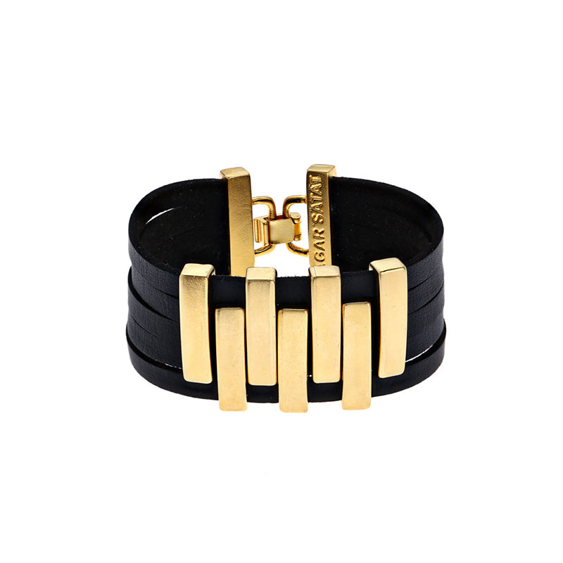 5 straps of genuine top class leather adorned with 7 zigzagging bars of 24 carat gold plated bars and to top it off a classy and unique easy to use closure.
