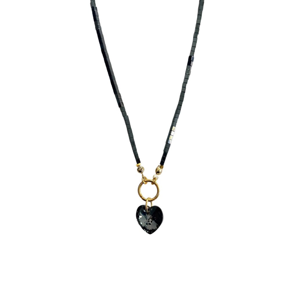With a matching and impressive heart-shaped Swarovski stone pendant.