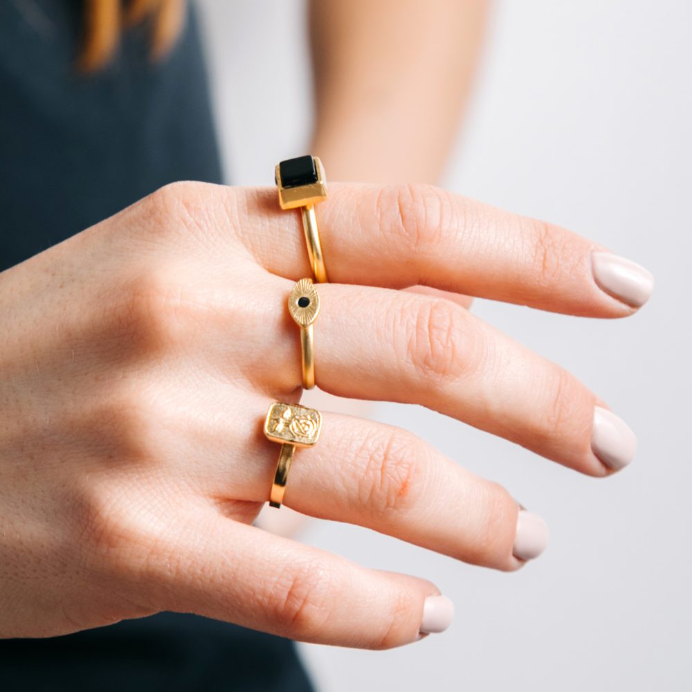 a black stone. The ring is adjustable to all sizes.