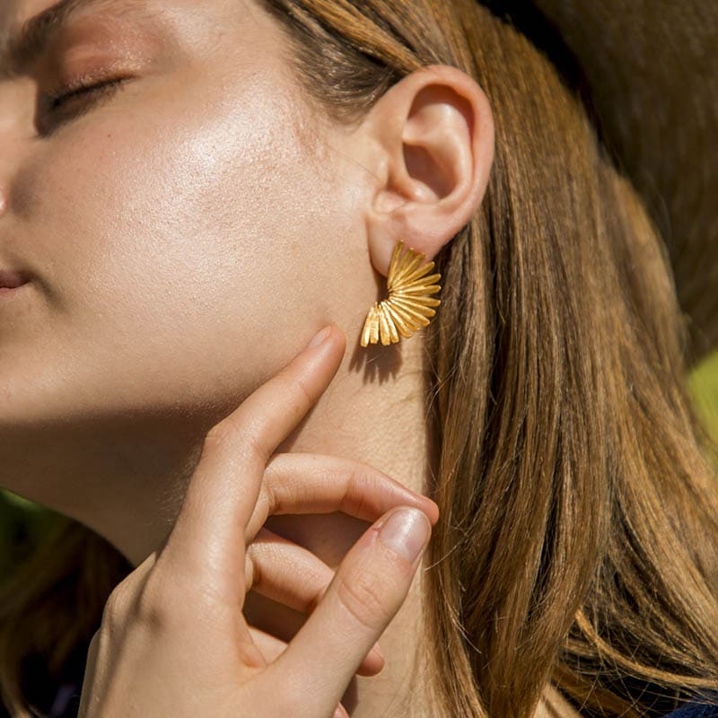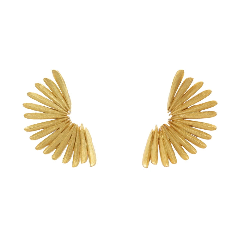 Geometrically shaped gold earrings; many regularly superimposed lines, of similar length. Its meaning is as simple as the feeling that causes it: the happiness found in small plans, alone or with friends. Earring with a modern cut, perfect for breaking with classic lines. and color: