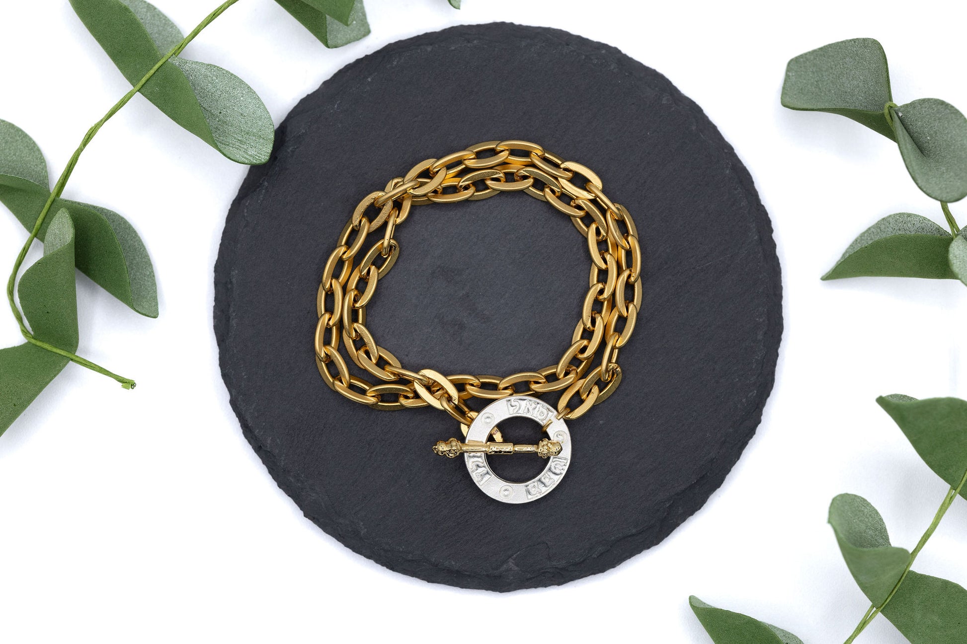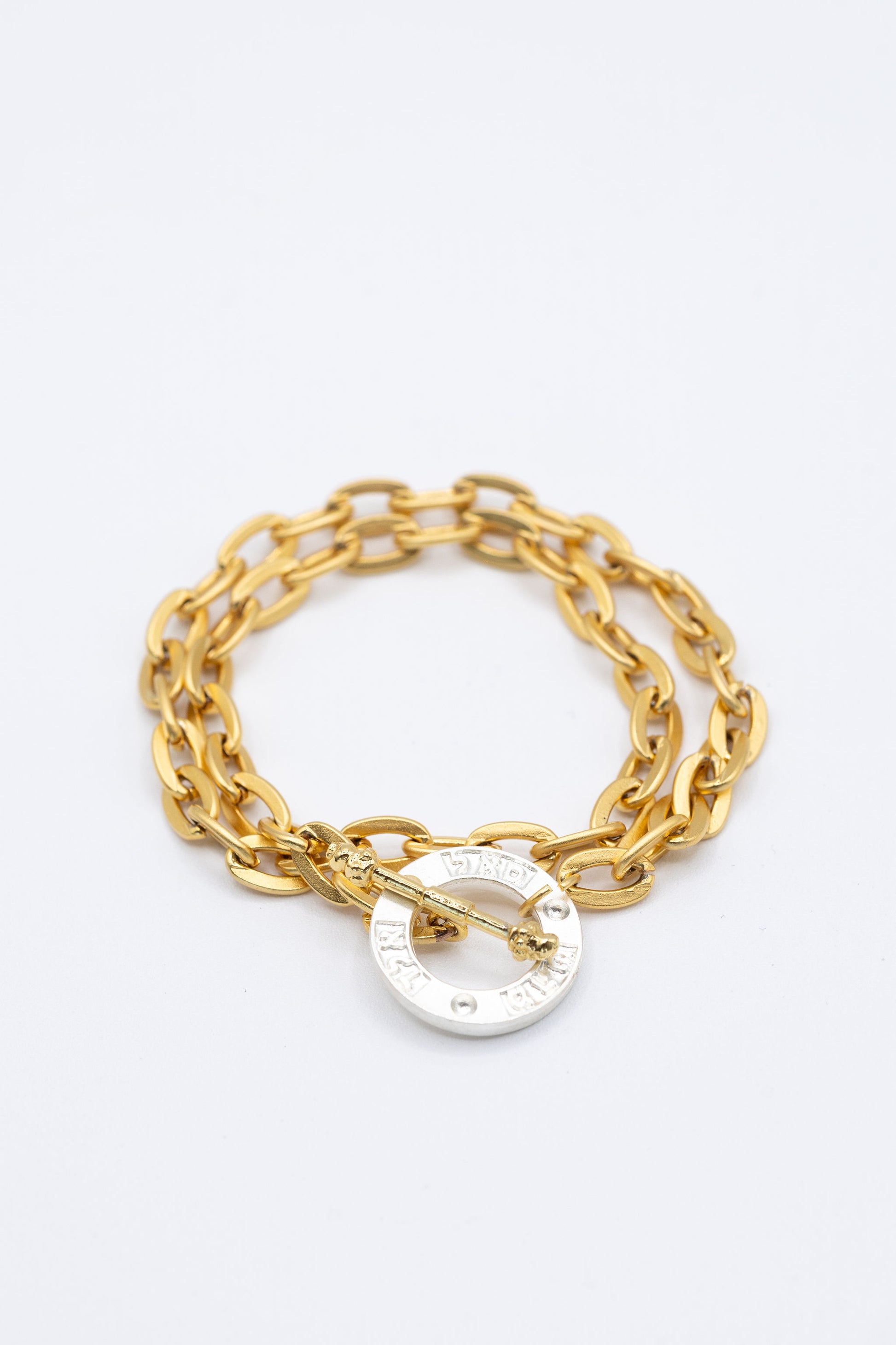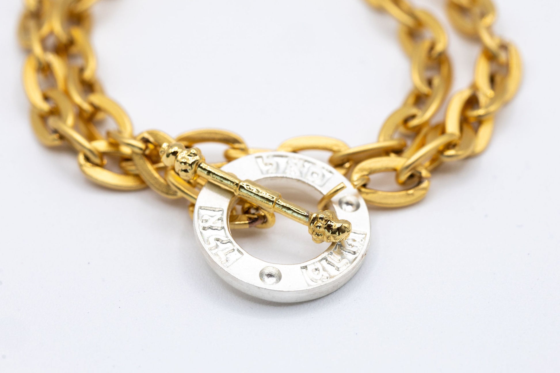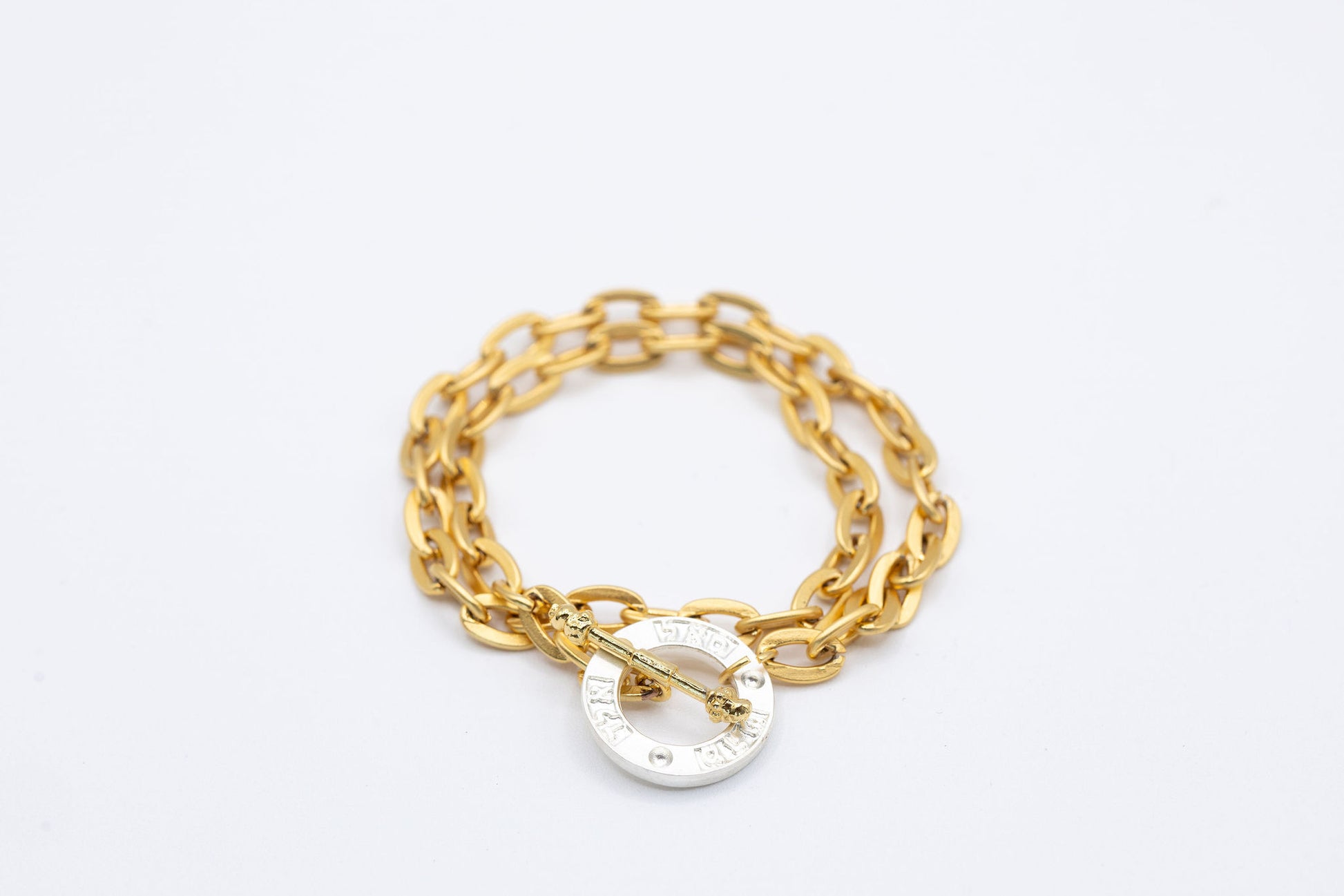Material: Matt gold plated chain with matt silver Hebrew words pendant.