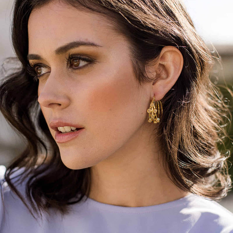 Golden earrings made up of three rings joined by several irregularly arranged stones. A very light and comfortable earring, perfect for bringing a little touch of brightness and color to the face. Ideal for your most basic looks to which you want to give a slightly more striking touch.