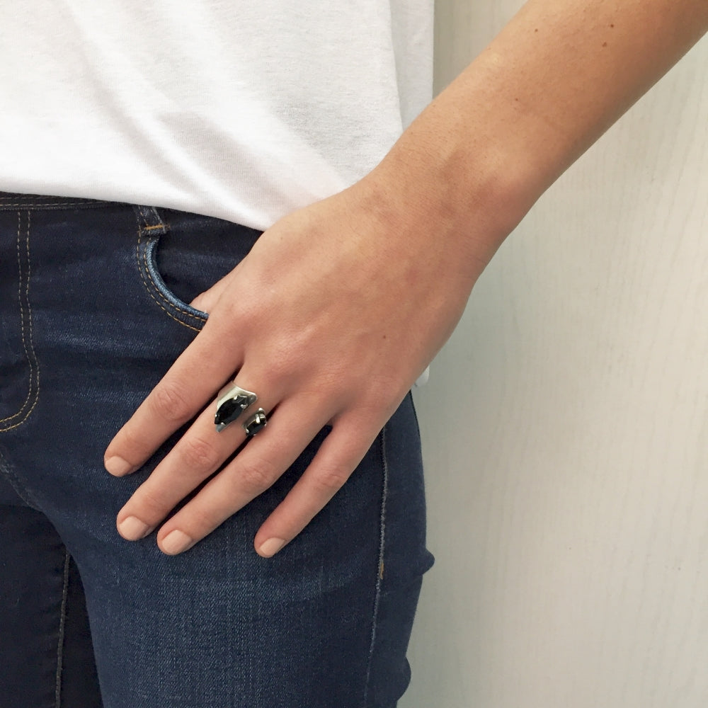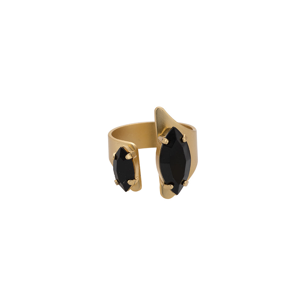 An asymmetrical ring set with two marquise-cut Swarovski stones. Made of metal casting with a high-quality 24-karat gold plating or matte silver plating. The ring is open and therefore adjustable to a wide range of sizes. Elegant and impressive, blends in perfectly with other rings